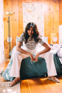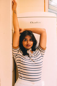 Our classic ringer tee; multi-colored stripes, light brown trim