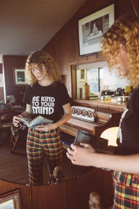 Woman stood reading a book wearing Be Kind to Your Mind Fitted Crewneck by The Bee and The Fox